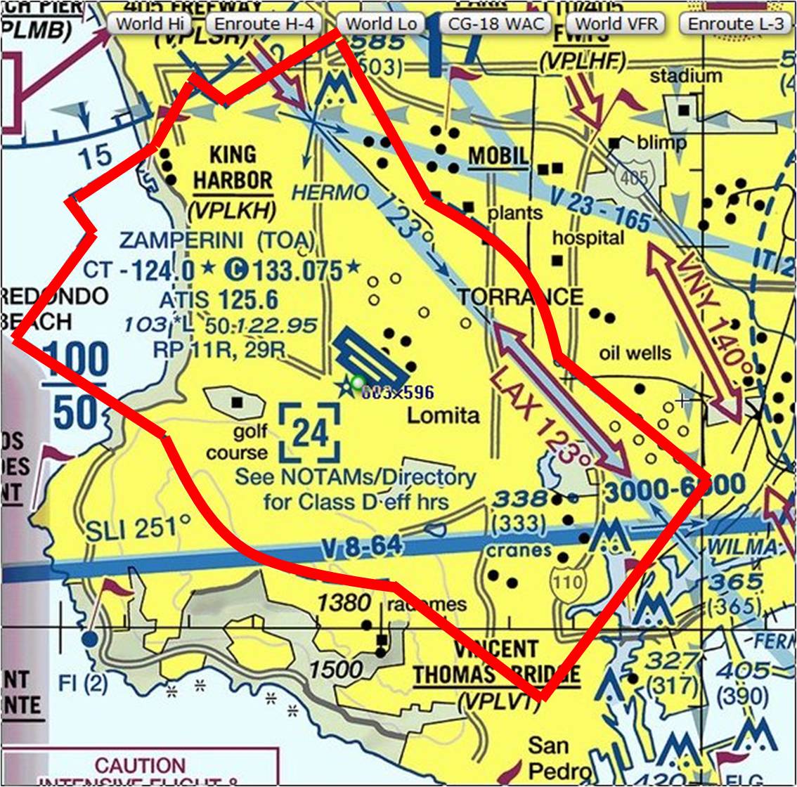 The Federal Aviation Administration (FAA) controls all airspace and aircraft flights. Surrounding Torrance Airport is a special area, defined by the FAA as "Class D airspace." It extends 5 miles from the center of the airport and up to 5000 feet above ground level. This special airspace, like that around all similar airports in the country, provides some special protections for our community:
